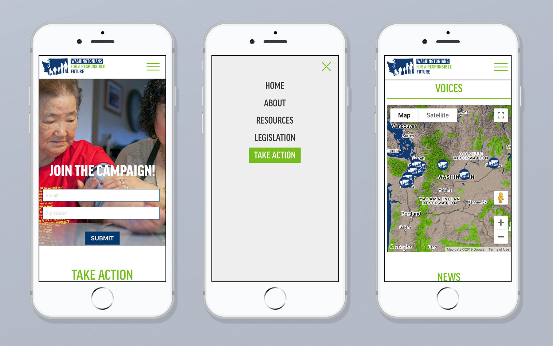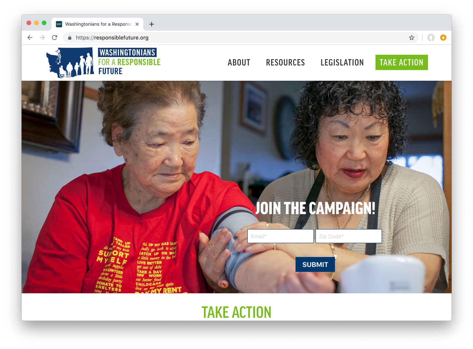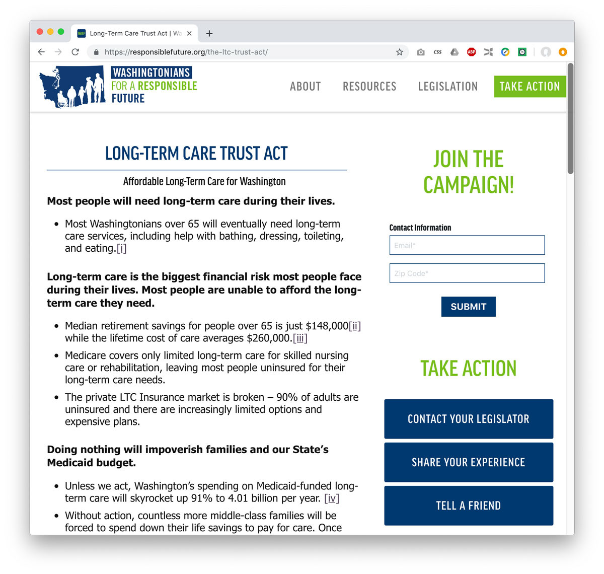 Washington state and the push for compassionate and responsible long-term care. Desktop and mobile UI and web design and development. Custom Google Map. Work with Summit Strategy